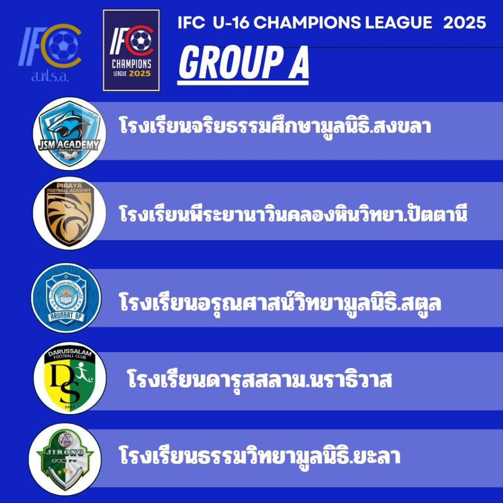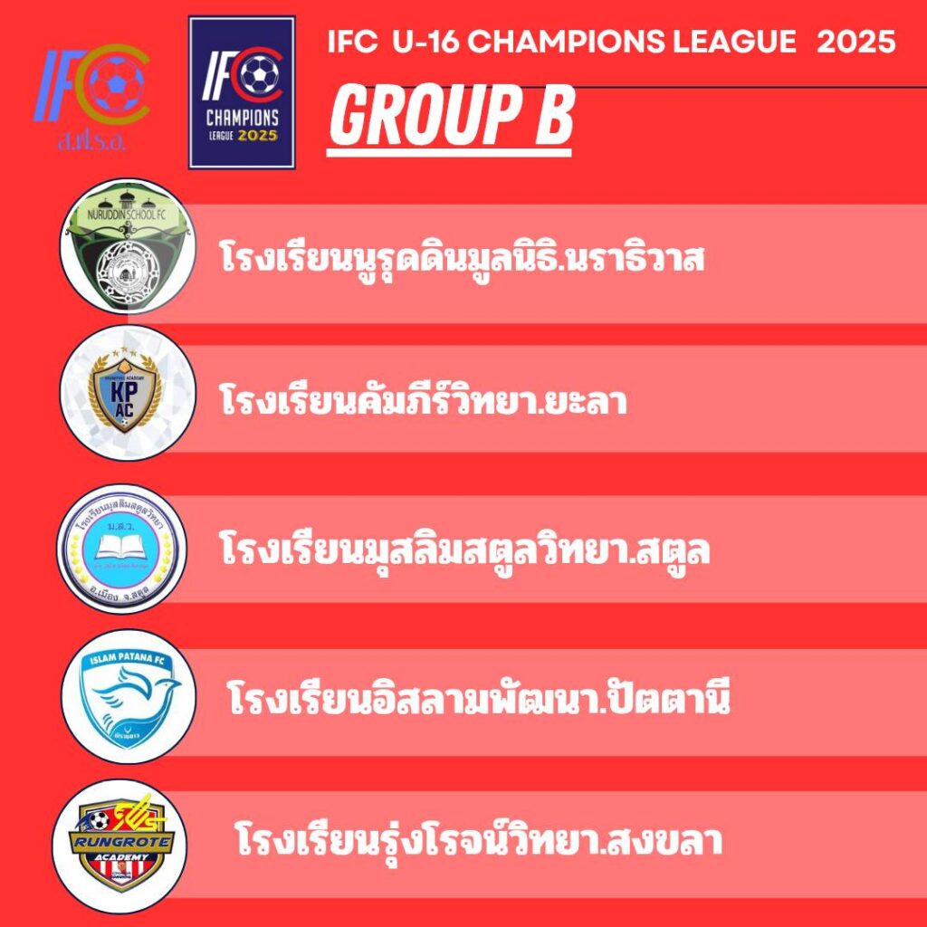 IFC I ผลการจับสลากรอบแบ่งกลุ่ม ฟุตบอล IFC U-16 CHAMPIONS LEAGUE 2025 นายนูรดิน อาบู ประธานจัดการแข่งขันฟุตบอลรอบแชมป์เปียนลีค u-16 2568 เป็นประธานในพิธีในกาจจับสลากเพื่อแบ่งสายและประชุมผู้จัดการทีมเพื่อชี้แจงระเบียบการแข่งขัน โดยจะเริ่มทำการแข่งขันนัดเปิดสนาม(รอบแบ่งกลุ่ม) วันที่16-17กรกฎาคม 2568 ศกนี้.