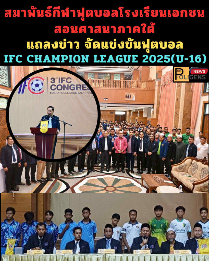 เมื่อ 1 กรกฎาคม 2568 ที่ มูลนิธิมะทา เขตเทศบาลนครยะลา อ.เมืองยะลา จ.ยะลา ดร.มูฮัมหมัดอัสมี อาบูบากา ประธานสมาพันธ์กีฬาฟุตบอลโรงเรียนเอกชนสอนศาสนาภาคใต้ หรือ IFC ได้นำคณะ ร่วมแถลงข่าวการจัดแข่งขันฟุตบอล IFC CHAMPIAN LEAGUE 2025 (U-16) ซึ่งจะเริ่มขึ้นในวันที่ 16 มิถุนายน 2568 ใช้สนามการแข่งขัน ในพื้นที่ ยะลา,ปัตตานี, นราธิวาส และสงขลา เป็นแบบระบบเหย้า-เยือน โดยมี ผู้บริหาร และครูผู้ฝึกสอนโรงเรียนเอกชนสอนศาสนา สมาชิก รวมทั้ง ตัวแทนนักกีฬา จาก 5 จังหวัดชายแดนภาคใต้ ที่ชนะเลิศเป็นตัวแทนแต่ละจังหวัด จังหวัดละ 2 ทีม รวม 10 ทีม เข้าร่วมรับฟังการแถลงข่าวในครั้งนี้