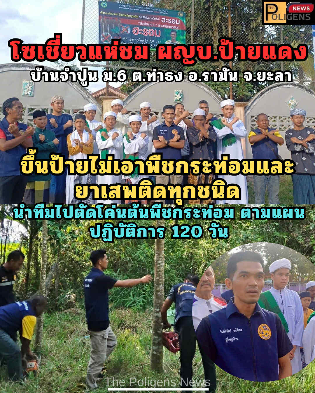 โซเชี่ยวแห่ชม ! ผู้ใหญ่บ้านป้ายแดง พื้นที่ อ.รามัน จ.ยะลา ขึ้นป้ายไม่เอาพืชกระท่อม ยาเสพติดทุกชนิด และนำทีมไปตัดโค่นต้นพืชกระท่อม ต้นตอของยาเสพติด ตามแผนปฏิบัติการ 120 วัน