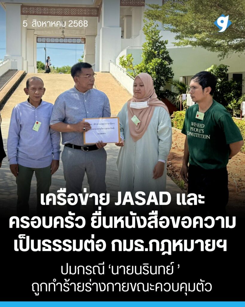 เมื่อวันที่ 5 สิงหาคม 2568 เครือข่ายผู้ได้รับผลกระทบจากกฎหมายพิเศษ JASAD ได้ยื่นหนังสือร้องเรียนต่อประธานคณะกรรมาธิการกฎหมาย การยุติธรรมและสิทธิมนุษยชน สภาผู้แทนราษฎร เพื่อขอให้ตรวจสอบเหตุการณ์ที่เกิดขึ้นกับนายนรินทย์ (สงวนนามสกุล) อายุ 27 ปี อาชีพครูสอนตาดีกา ซึ่งถูกเจ้าหน้าที่ควบคุมตัวในช่วงเช้ามืดของวันที่ 30 กรกฎาคม 2568 เวลา 04.30 น. ที่บ้านเลขที่ 4/3 หมู่ 3 ตำบลน้ำบ่อ อำเภอปะนาเระ จังหวัดปัตตานี