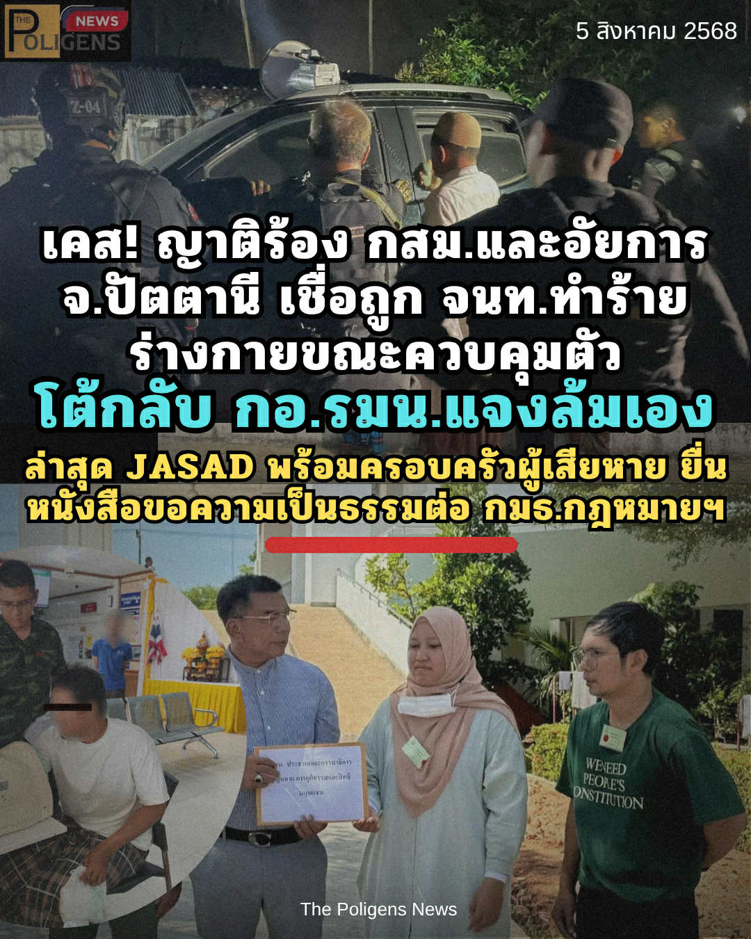 #ข่าว #กระบวนการยุติธรรม #หลักสิทธิมนุษยชน #JASAD #ญาติร้องคณะกรรมการสิทธิมนุษยชนแห่งชาติ #อัยการจังหวัดปัตตานี #กองอำนวยการรักษาความมั่นคงภายในภาค4ส่วนหน้า #แจงเหตุล้มเอง #ร้องกมธกฏหมายฯ #ขอความเป็นธรรม #ThePoligensNews