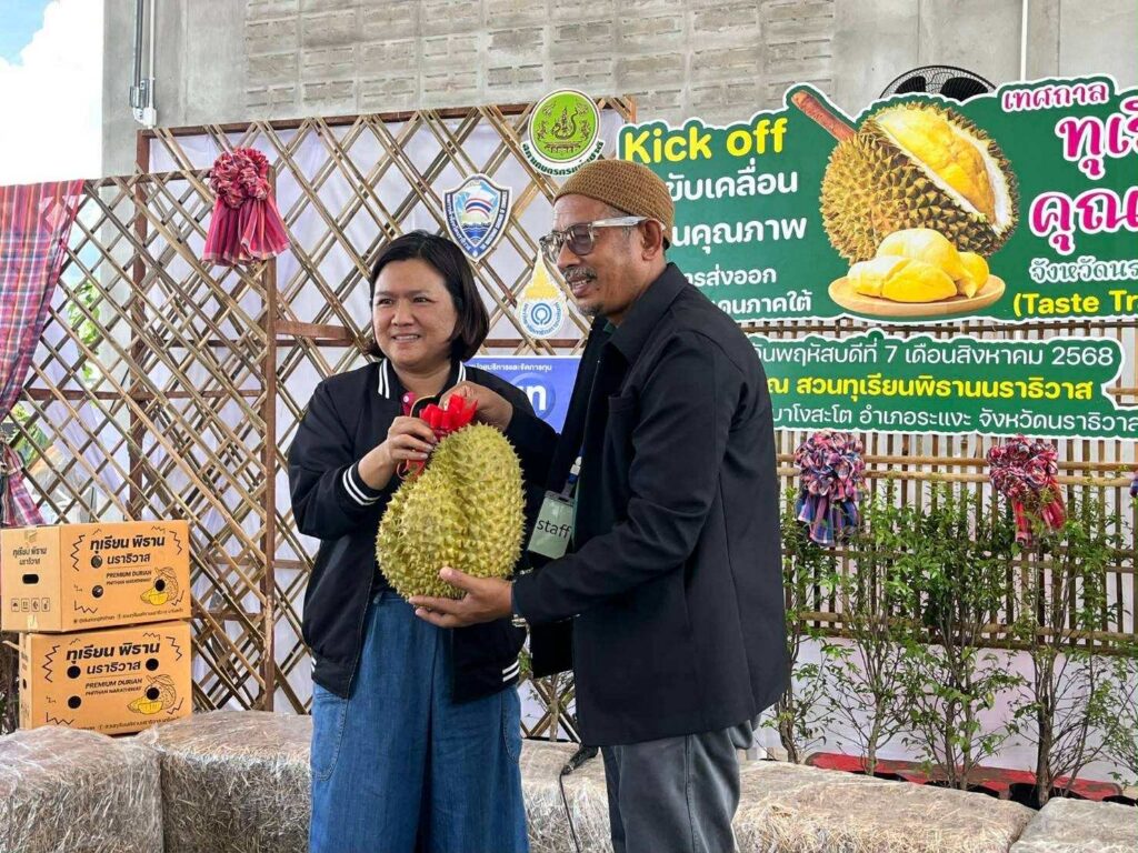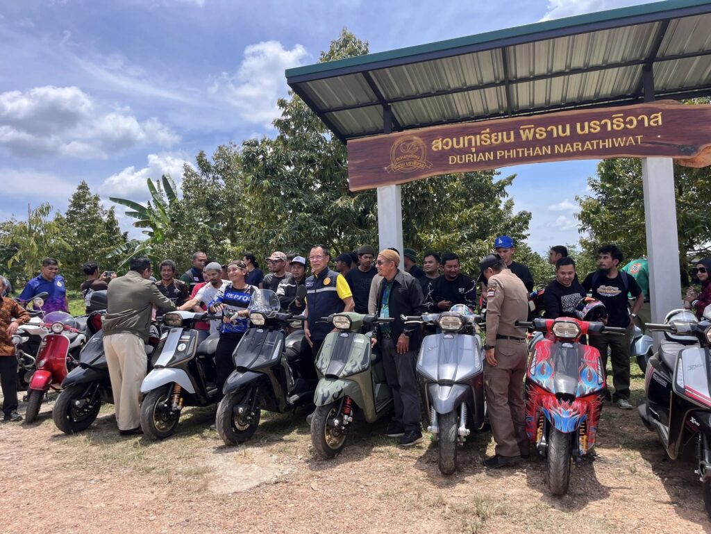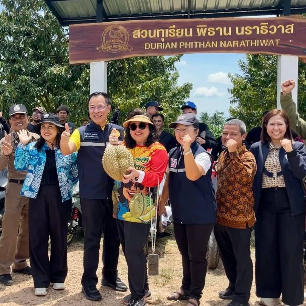 วันนี้ 7 ส.ค. 2568 ณ #สวนทุเรียนพิธานนราธิวาส ต.บาโงสะโต อ.ระแงะ ได้ฤกษ์ Kick Off “เทศกาลทุเรียนคุณภาพนราธิวาส 2568” (Taste Trade Travel) อย่างยิ่งใหญ่ โดยมี นายวีรพัฒน์ บุณฑริก รองผู้ว่าราชการจังหวัดนราธิวาส เป็นประธาน พร้อมด้วยเครือข่ายเกษตรกรจากสามจังหวัดชายแดนใต้ รวมถึงคณะรถจิ๊บและเวสป้าสุดเท่จากมาเลเซีย มาร่วมสร้างสีสันภายในงาน