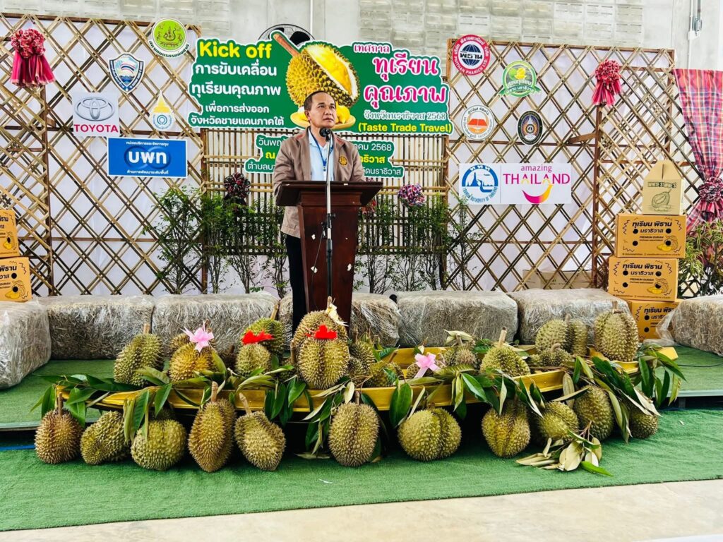 กิจกรรม Kick off ทุเรียนคุณภาพนราธิวาส จัดขึ้นรวมกับกิจกรรมต่างๆ ภายใต้งานเทศกาลทุเรียนคุณภาพจังหวัดนราธิวาส ณ สวนทุเรียนพิธานนราธิวาส ต.บาโงสะโต อ.ระแงะ โดยมีกิจกรรมน่าสนใจมากมาย เช่น บุฟเฟต์ทุเรียนหลากหลายสายพันธุ์ กิจกรรมขับเคลื่อนแผนพัฒนาห่วงโซ่มูลค่าทุเรียน นิทรรศการการ พัฒนาห่วงโซ่มูลค่าทุเรียนภายใต้การสนับสนุนของ บพท.