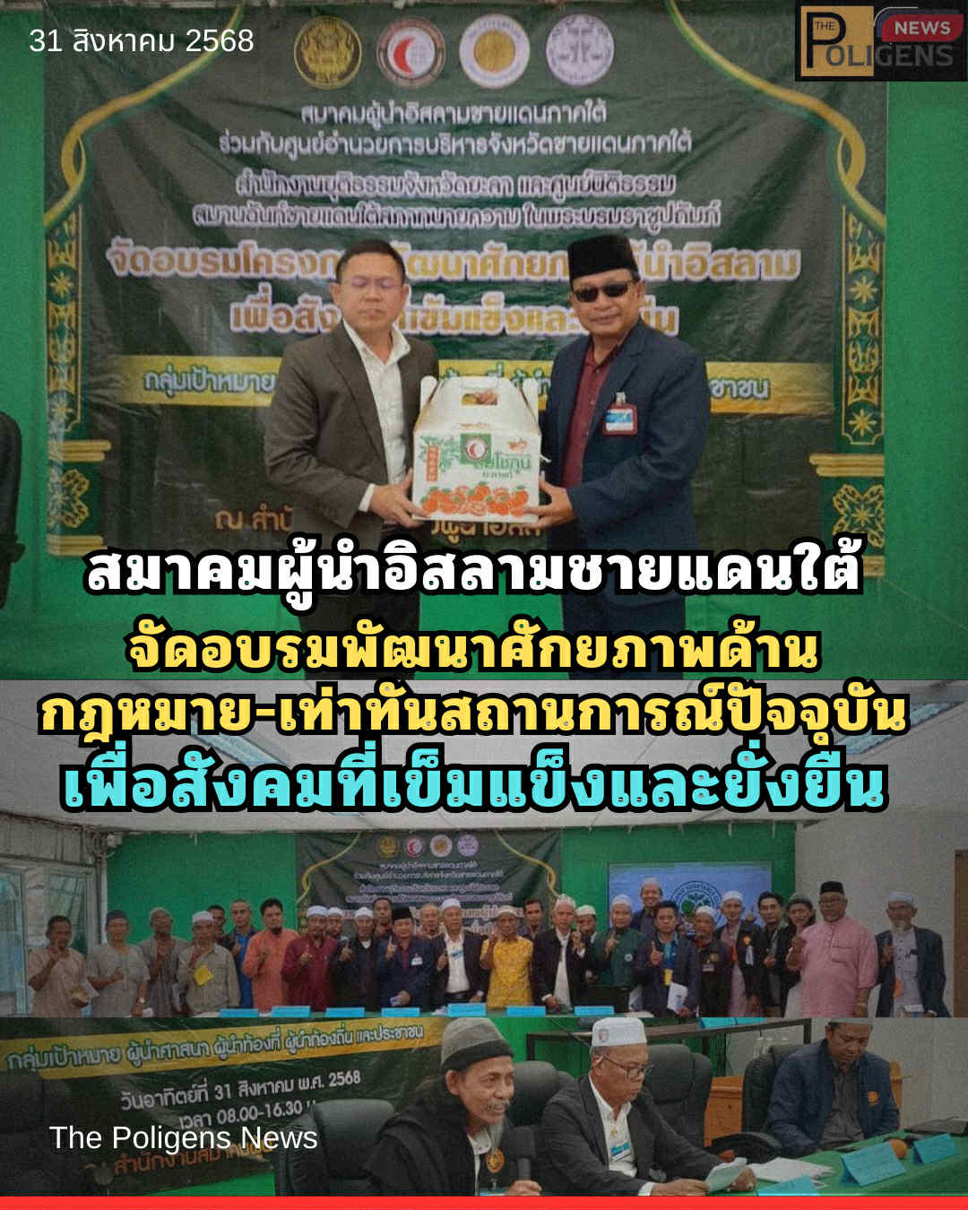 เมื่อวันอาทิตย์ที่ 31 สิงหาคม 2568 เวลา 08:30-16:30 น. สมาคมผู้นำอิสลามชายแดนภาคใต้ ร่วมกับศูนย์อำนวยการบริหารจังหวัดชายแดนภาคใต้ สำนักงานยุติธรรมจังหวัดยะลาและศูนย์นิติธรรมสมานฉันท์ชายแดนใต้สภาทนายความในพระบรมราชูปถัมภ์